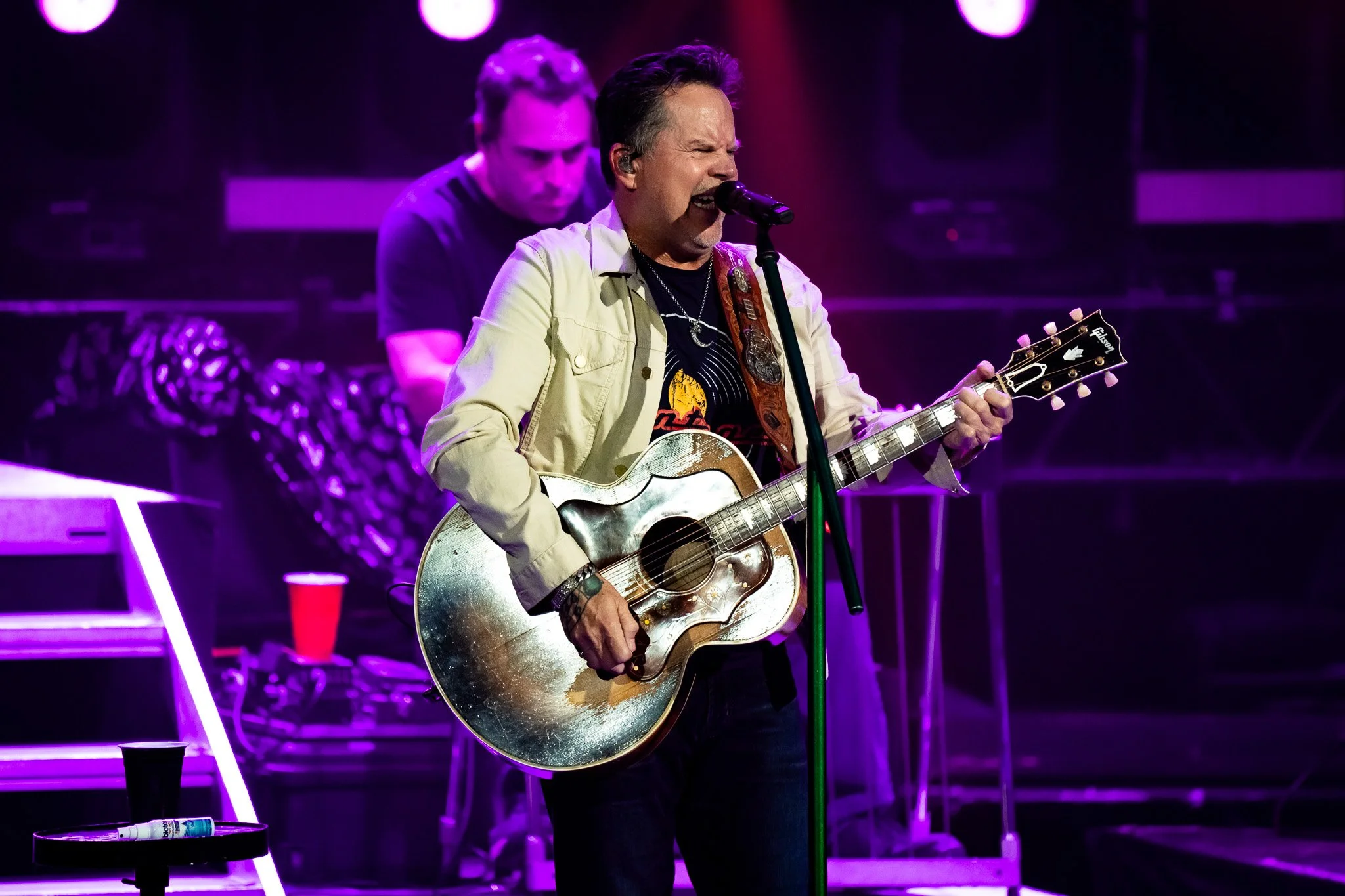 As the unmistakable voice of Johnny Cash resonated over the PA system, anticipation surged through the audience. The moment had arrived. Gary Allan took the stage atop a riser with stairs leading down, bathed in lights as the opening strains of Tough All Over reverberated through the theater. The crowd erupted in applause and cheers, the kind of welcome befitting a country music legend.
