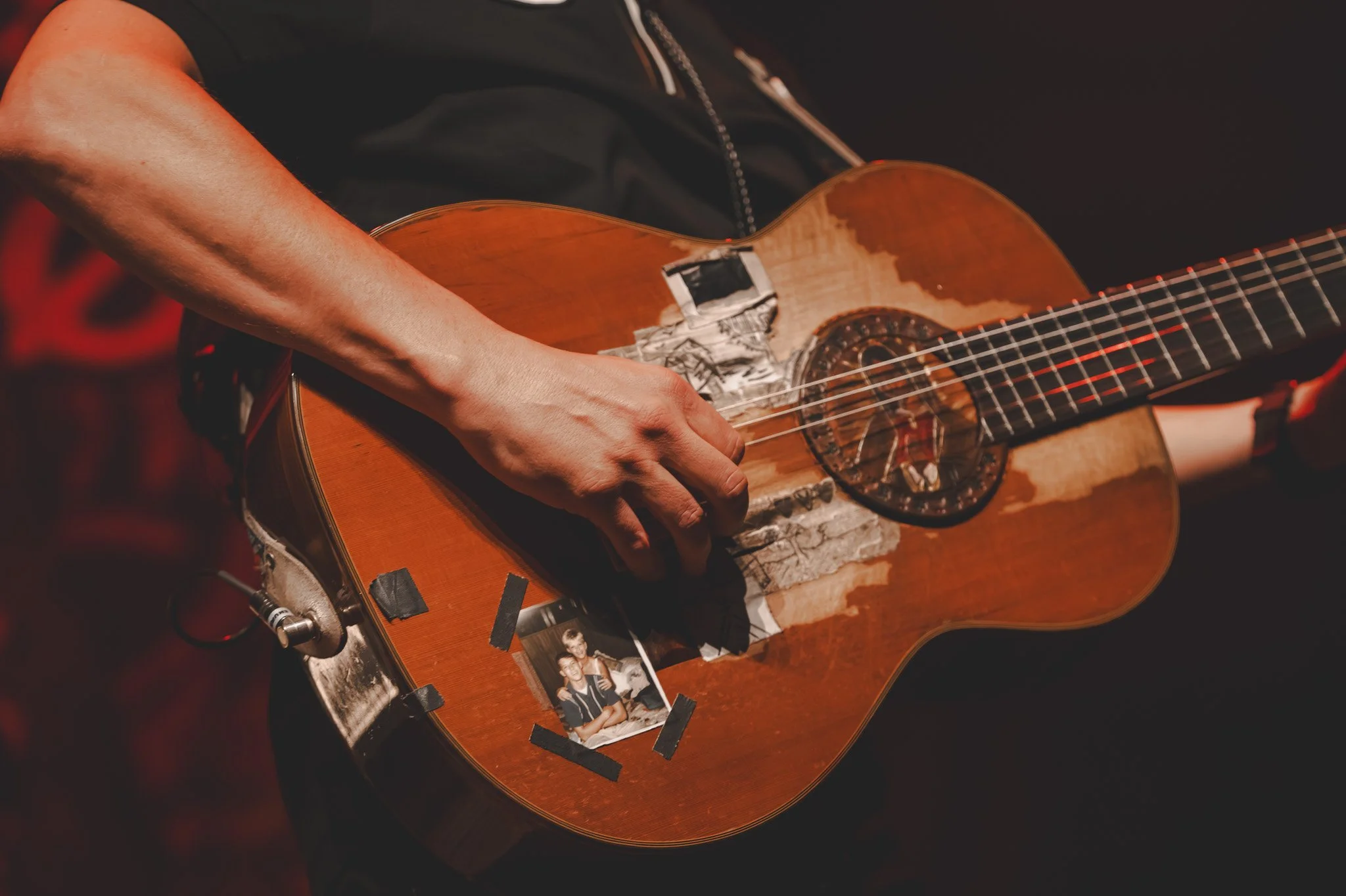 “I have covered up my scars for a long time with band aids, that’s why I call them patches. Now I use masking tape to cover scars, as you can see my guitar has a lot of scars.”