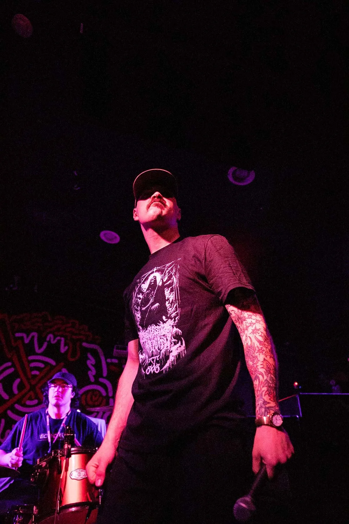 Next up was Larcenia Roe, and I had never heard of them, but boy was I hooked. The drummer sported a horror-esque mask, and from eavesdropping amongst other attendees, they pushed the horror-metal feels in their sound. I definitely heard that, and it was all fitting. The most pit continued to conquer the floor space in front of the stage, where there were few corner spots to avoid the massive energy.